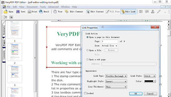 选择菜单工具->链接工具,或按工具栏上的编辑链接按钮。然后编辑模式将更改为添加链接。在这种模式下,您可以在PDF页面的任何位置绘制一个矩形,右键单击该区域,然后在内容菜单中选择属性以打开对话框。在此对话框中,可以将绘制的矩形链接到页面、文件或网页。