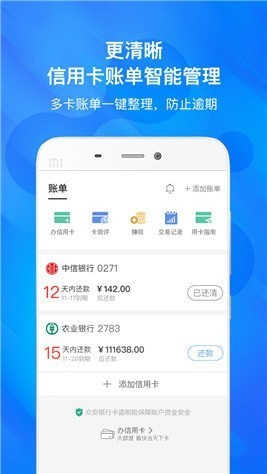 智能账单管理:轻松导入信用卡账单,还款日期、还款金额一目了然;多卡管理,告别“卡多难管理”的麻烦。