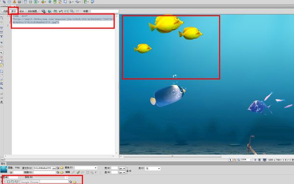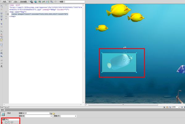 第二步,要什么形状选什么工具框出你要加热点的区域,我用了方形热点是那条蓝色的小鱼;(注意,此时链接那儿是个“#”符号)