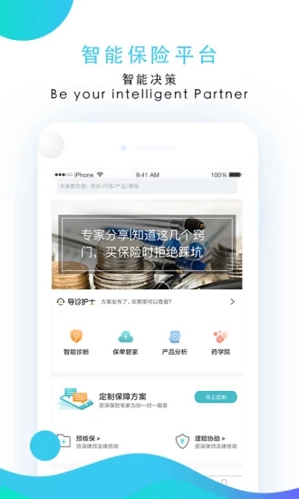 1、人工智能诊断:测风险?挑产品?怕忽悠?人工智能帮你预测风险、匹配产品,给你客观公正的风险管理和保险配置。2、定制保障方案:单身贵族?有娃族?银发族?保险专家一对一服务,针对每个人需求差异定制量体裁衣的全方位保障方案。
