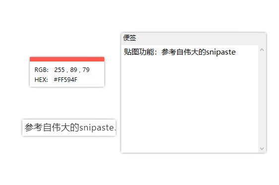 参考自伟大的snipaste。贴图、取色、文本便签、可以编辑。没有snipaste的强大功能,就是简单贴个图片。