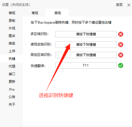 在设置中设置透视快捷键