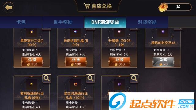 如上图,我们可以用150个积分兑换100个黑夜穿行之证,100积分兑换50个异形结晶、300积分兑换90-93级升级卷一张、70积分兑换5个精炼时空石、150积分兑换黎明裂缝通行证6张、1000积分兑换星空深渊通行证10张、150积分兑换10个魔岩石。上面的奖励除了星空深渊通行证之外其他每7天会重置一次。