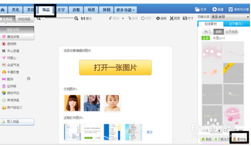 1.点击打开美图秀秀软件,在美图秀秀软件的首页我们点击上方的主菜单栏里的【饰品】按钮,在弹出的饰品编辑页面里我们点击右下方的【素材包】按钮。