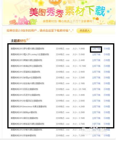 2.此时页面会切换到美图秀秀素材包的下载页面,在美图秀秀素材包下载页面里我们可以看到很多主题的素材包,我们下载前可以点击素材包旁边的示例图先预览素材包,如果我们喜欢该素材包点击【立即下载】