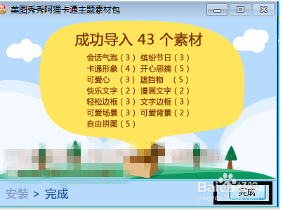 5.此时会弹出素材包软件安装进度的对话框,在此对话框内我们可以看到软件的安装进度,待软件安装完毕后我们点击对话框内的【完成】按钮即可,这时我们可以在对话框内看到我们安装了那些素材到美图秀秀软件里。