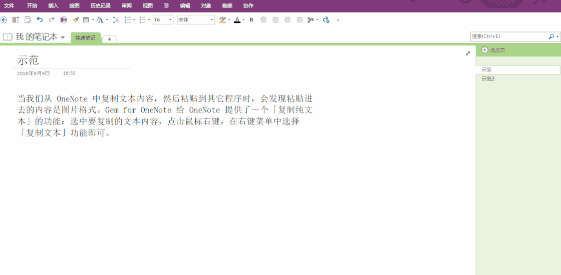 当我们从 OneNote 中复制文本内容,然后粘贴到其它程序时,会发现粘贴进去的内容是图片格式。Gem for OneNote 给 OneNote 提供了一个「复制纯文本」的功能:选中要复制的文本内容,点击鼠标右键,在右键菜单中选择 「复制文本」功能即可。