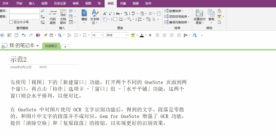 先使用「视图」下的「新建窗口」功能,打开两个不同的 OneNote 页面到两个窗口,再点击「协作」选项卡 -「窗口」组 -「水平平铺」功能,这两个窗口则会水平排列,以便对比。