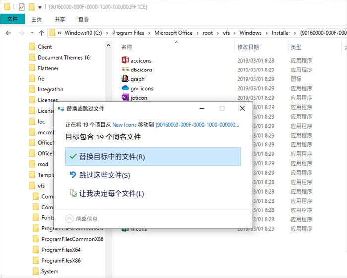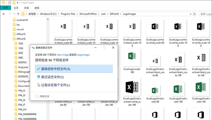 2. 首先是替换组件,方法是打开现有Office组件文件夹,将“1. icons”中的所有文件复制过去。在此过程中,会提示覆盖及文件夹权限,根据提示同意即可。
