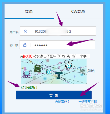 2、输入你的企业的用户名,一般情况下为你企业的信用代码证号,代码证号一共18位,由17阿拉伯数字+一个大写字母组成。然后输入密码,点击下面的汉字验证码,如果验证正确在验证码下面会有提示,如下图所示,然后点击“登陆”即可。