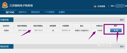 3、登陆后会自动进入“用户中心”这里可以看到你这个月或者这个季度的税务有没有申报,如果不需要申报,这里则没有内容。如下图,我们看到的是这个季度的税务还没有申报,上面列出了税务的各类、起止时间、申报状态等,我们点击右侧的“申报”按钮,进入申报程序。