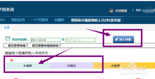 4、我们进入到“增值税小规模纳税人月(季)申报”页面,这里的相关信息更详细些,但是有些对我们而言,可以不用看。我们只需要看如下图所示的几项内容。一是税款所属的时间,二是税务申报状态的进度,三是点击“进入申报”进行税务申报。如下图所示。