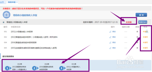 5、点击“进入申报”后,即进入税务申报报表填写环节,如下图所示。目前显示的是“未申报”,4个表的状态均为“未填写”。下面我们按照下面给出的建议填表顺序进行填写。也可以直接从001表至004表填写,反正是零申报,没有税务内容。