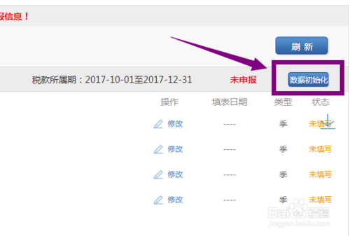 6、在填写税务登记表格之前,我们需要对所有表格进行初始化设置。点击表格内容的右上角位置,有个“数据初始化”按钮,点击它对所有需要填写的表格进行初始化设置。
