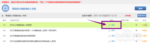 9、下面我们以001表格为例,点击001表后面的“修改”,如下图所示。点击之后即进入001表填写模式。