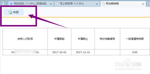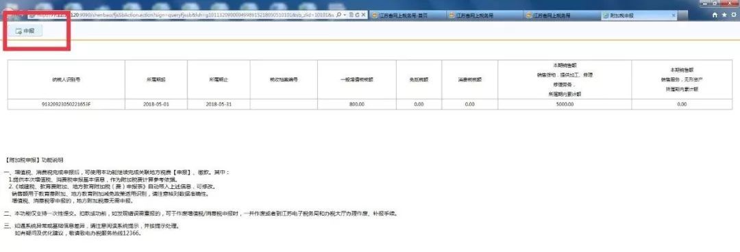 17、这时会进入附加税申报页面,我们点击左上角位置的“申报”按钮进行税务申报。
