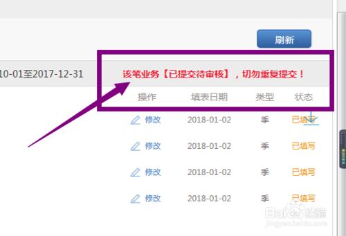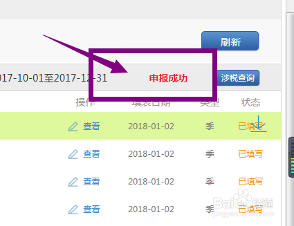 24、我们会看到,在页面右侧位置,原来的“该笔业务已提交待审核,勿重复提交”的字样,变成了“申报成功”。表明此次申报完成。