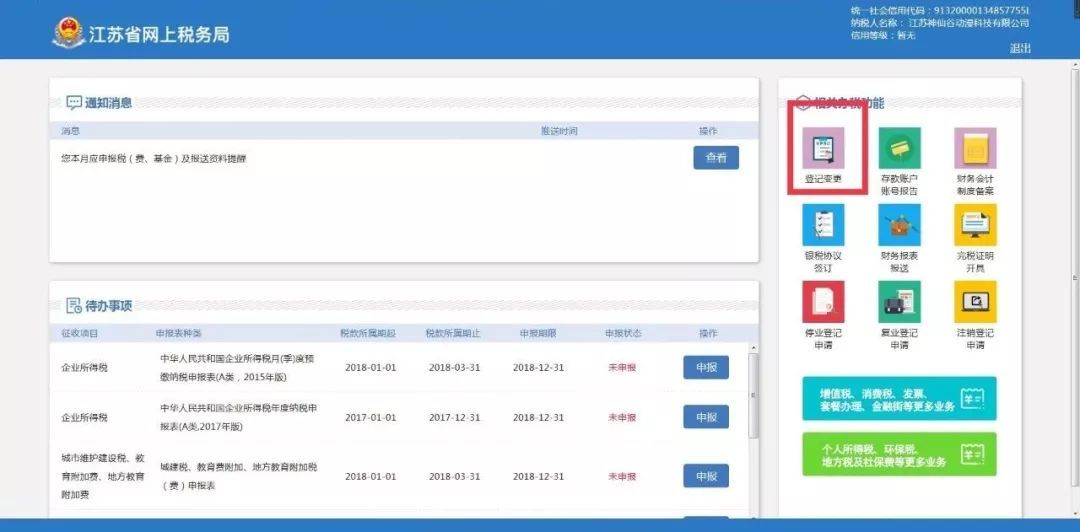 1.点击右侧相关办税功能栏中“登记变更”按钮