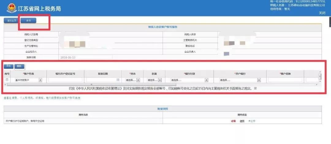 3. 根据实际情况录入相关账号信息,带“*”栏为必填项目,如需同时录入多账号信息,点击“添加”按钮依次录入即可;若信息录入错误,勾选错误信息前□,点击“删除”即可;完成账户信息录入后,根据页面提示,上传所需的pdf格式附件;附件上传完成后点击左上角“保存”并“提交”,税务端审核通过后,即可完成存款账户账号报告。
