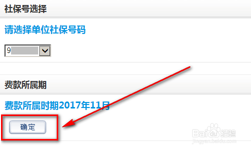 4、点击页面左边的【社保费管理】后,页面会弹出社保号选择,费款所属期,点击【确定】;