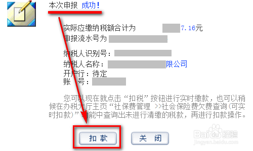 10、点击【确定】后,即完成了社保的申报工作,此时,页面会弹出扣款提示,点击【扣款】;