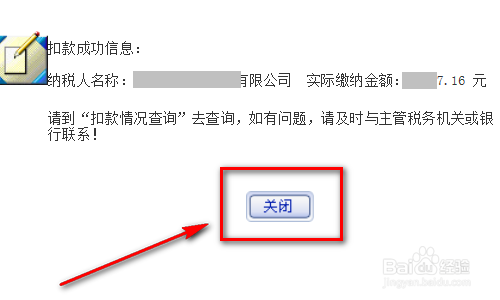 11、点击【扣款】后,就完成了扣缴工作,扣款成功后,页面会弹出扣款成功的提示,点击关闭即可。