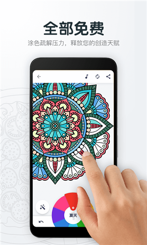 1、全部免费:涂色疏解压力,释放你的创造天赋。2、海量线稿:曼荼罗、动物、花卉、地点等20+分类图画。