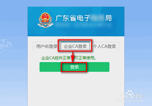 一、广东电子税务局怎么增加购票员?进入电子税务局,把CA插在电脑上,点击【企业CA登录】,输入密码框,点击【确定】。
