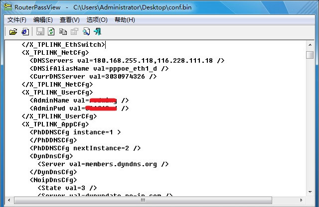 点击备份配置文件后,浏览器便会让你保存一个文件到电脑,这里是“config.bin”。然后,我们打开 RouterPassView,点击“文件”->“打开路由器配置文件”,找到刚才的 config.bin 文件打开,即可找到路由器里面的密码信息了,如下图:
