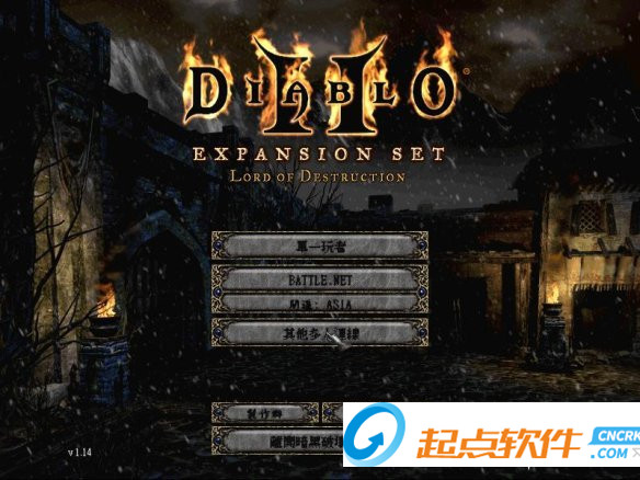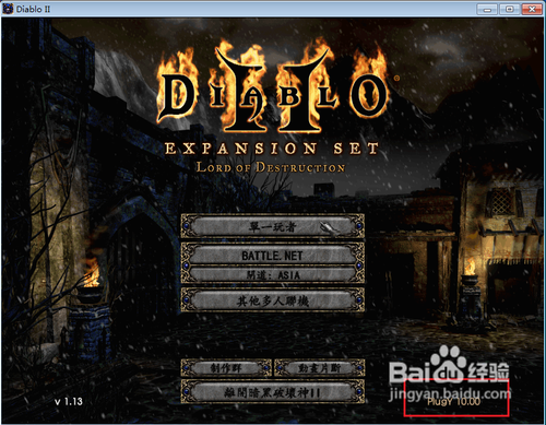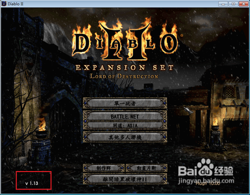 所有游戏都有自己的版本号与更新系统。暗黑2的版本都是以1.XX的版本号写出的(后面有可能加一个字母,比如1.11b、1.13c,如果两个版本号码一样就字母不一样,比如1.11和1.11b,那么差别很小)等,可以在进入游戏时候左下角看出(如图)。很多新手以为版本是个小问题,也就改一些细节的东西。对于某些游戏,这没错;但是对于暗黑2,其实版本的问题非常重大,甚至对玩法有本质上的影响(再次看出暗黑2这个游戏的复杂性)。大致上,我们可以说版本有如下影响: