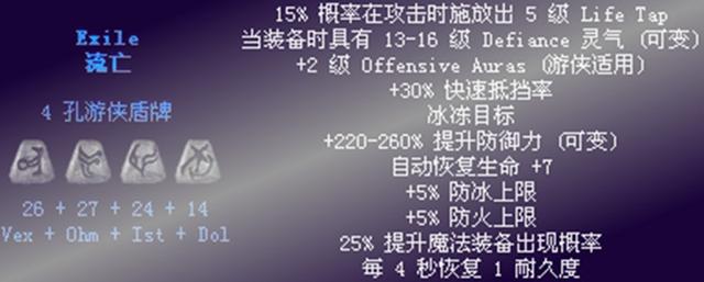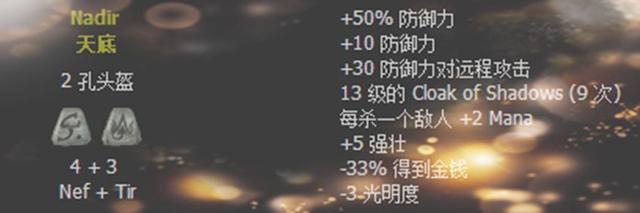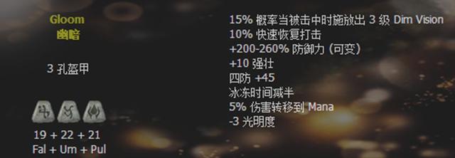 很多新手不知道,暗黑2里面的盔甲和盾牌分为轻、中、重三类,区别是对于人物跑步速度的影响,轻的不减少跑步速度,中的减少5%,重的减少10%(并加倍精力损耗)。一般来说,如果人物穿着轻甲,冰冻以后移动速度影响不是太大,重甲就影响十分严重,因此在给雇佣兵做符文之语的时候(要是没有无法冰冻属性的装备的话),尽量选轻甲,“执政官铠甲”是轻甲里面防御最高的,因此经常使用做符文之语。