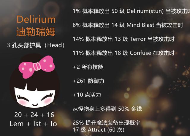 迪勒瑞姆是以前最难做的一个符文之语,有刺客技能,可以震退怪物,有死灵诅咒,可以吓跑怪物,有死灵的“迷乱”可以让怪物互殴,还有死灵的“吸引”,可以让怪物被其他怪物攻群殴。