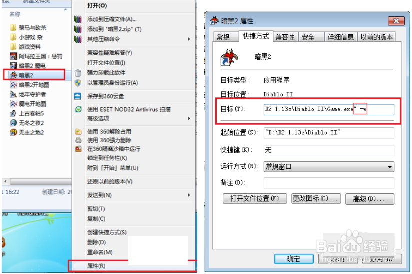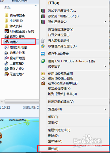 ①明确自己从哪个图标进入暗黑2游戏,在进入游戏的图标上面点右键,选“属性”,见第一张图。(注意,有的人直接在游戏的文件夹下面进入游戏,就要到文件夹下面进入游戏图标那里点右键;有人是从桌面快捷方式进入游戏的,就要在桌面快捷方式上面点右键)