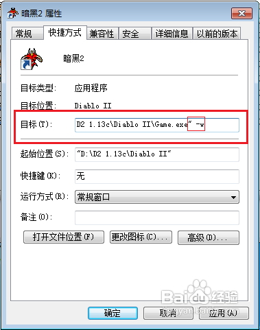 ②在“目标”一栏完整的快捷方式后面加三个字符:空格、-、w。注意,必须在整个目标路径后面加,也就是整个的引号后面;而且必须有空格。如果加错了系统会弹出对话框,提示不是合法路径。完成这一步以后进去就是窗口模式游戏了!(注意,好像暴雪出的所有单机游戏都可以用类似的方法窗口化,比如魔兽3可以加空格、-、window)