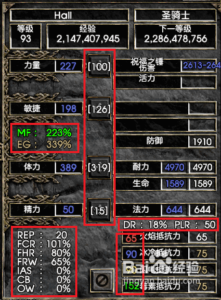 暗黑2游戏里面人物属性面板(按C键可以进入)只有属性点、元素抗性、防御、准确率等信息,不是很全面,大箱子补丁可以在面板里面帮助你把其他属性都统计出来。比如原始属性点(看图中属性点右边的白色数字,这是你扣除一切装备以后本来有的属性点)、原始抗性(你所有装备的元素抗性相加以及你自身抗性的和,一般来说超过75也只能按75算,见抗性左边的彩色数字)、各种MF值、压碎性打击率、加快攻击速度等等(见各种缩写旁边的数字)。