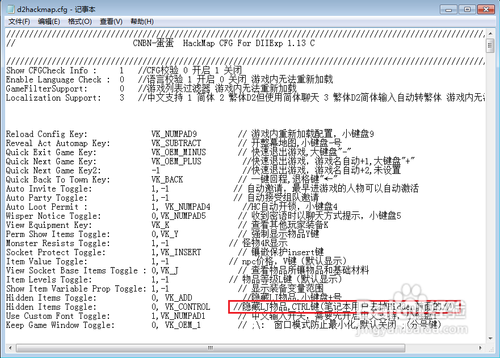 设置的大致方法是启动hackmap主程序的时候,点右边的“配置文件”,再点“编辑d2hackmap.cfg”,之后会打开一个文本文件。里面每一项代码都是一个功能,如图,对于简单的一些功能,中间参数部分,有的只有键盘代码,那是直接使用的功能;有的有两个参数“a,b”以逗号隔开,前一个a参数是1或0表示刚进入游戏的时候这个功能是默认开启还是关闭;第二个参数b表示作为开关的按键是什么(都是键盘上按键的代码),当然也可以是-1,表示没有按键开关,始终保持刚进入游戏的开启或者关闭状态。后面//之后有汉语,是对功能的解释。注意观察,对于笔记本玩家,可以找到文件中所说的那个地方去掉//字符,把ctrl当屏蔽物品的开关。当然还有一些复杂的,比如哪些物品不屏蔽、显示颜色等等(需要查物品代码、颜色代码),不一一细说,也是在这里设置的。