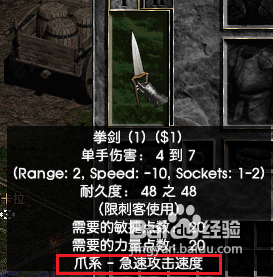 第二个问题,关于武器上写的“XX攻击速度”。这里特别提醒新手,武器上写的“XX攻击速度”是很不准确的,同样写“快速攻击速度的”,不同人物拿上实际攻速的帧数不同;不同人看同一件装备的攻速也是不同的(比如刺客的爪,刺客自己看是“急速”,别人看是“缓慢”,如图,第一个是刺客自己看,第二个是野蛮人眼中的)。