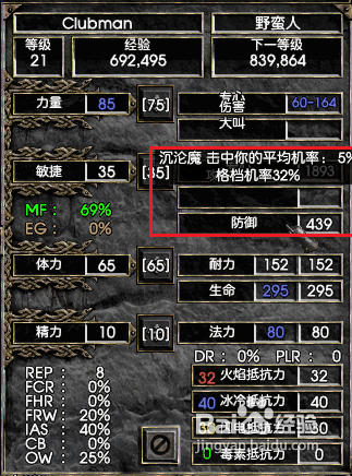 格挡率是盾牌彻底挡住敌人攻击的几率(可以挡远程物理攻击,包括女妖光弹等),有75%的上限,注意挡住以后人物会被震一下,之后一小段时间不能再做任何动作,即使画面上显示你做了也实际无效(一般这段时间很短,就几f的时间,+快速格挡速度的装备就是起缩小这段时间的作用),而且格挡率与盾牌原始格挡率和人物敏捷共同相关,不要误以为只和盾牌表面上写的格挡率相关(最终格挡率有一个比较长的换算公式,这里不给出),真正人物的最终格挡率在C键的人物属性栏里面可以看到(如图,把鼠标移动到上去防御力一栏,会显示)。当然刺客可以用武器格挡,亚马逊可以闪避避免伤害,这些都是具体人物的技能,这里不详述。