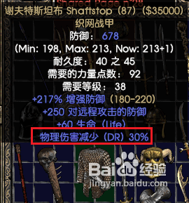 XX%物理伤害和所有抗性类似,只不过作用于物理伤害。如图,给出了暗黑2里面很有名的降低物理伤害的暗金衣服,俗称物免甲。
