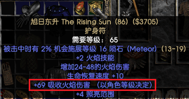 下面展示一个吸收火焰伤害很强大的典型装备——旭日东升项链,现在可以理解为什么拿它刷第三幕崔凡克议会成员,九头蛇打你反而加血了吧?(详见刷装备下篇)