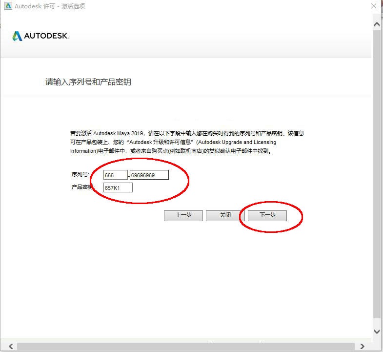 4、在打开的玛雅maya输入序列号窗口中输入序列号666-69696969 ,产品密钥 657K1,输入完成后点击【下一步】。