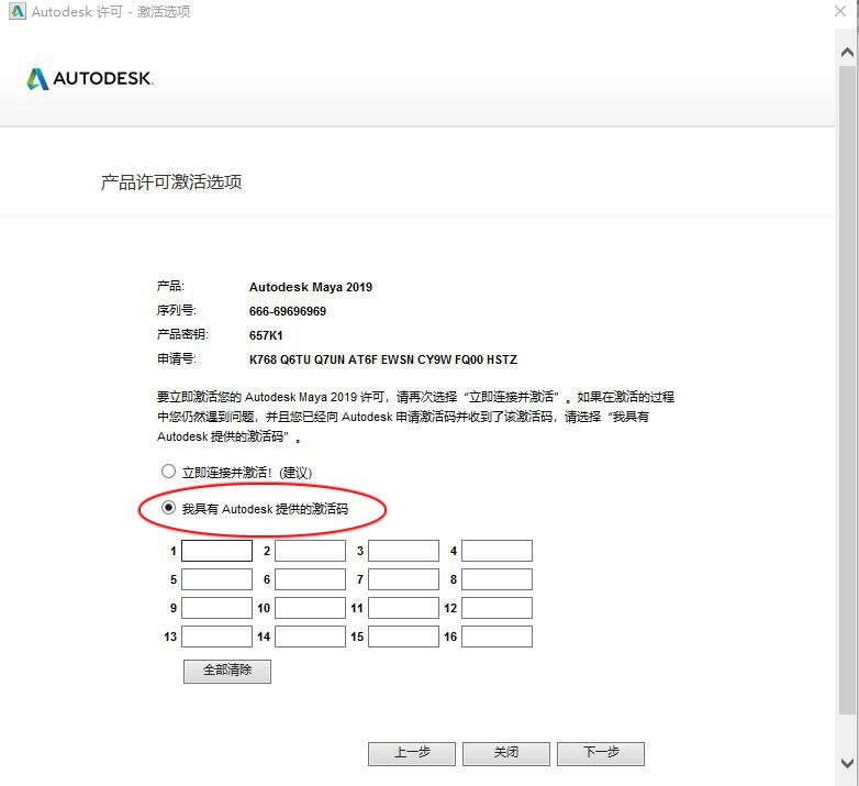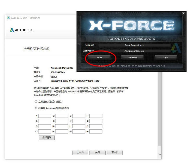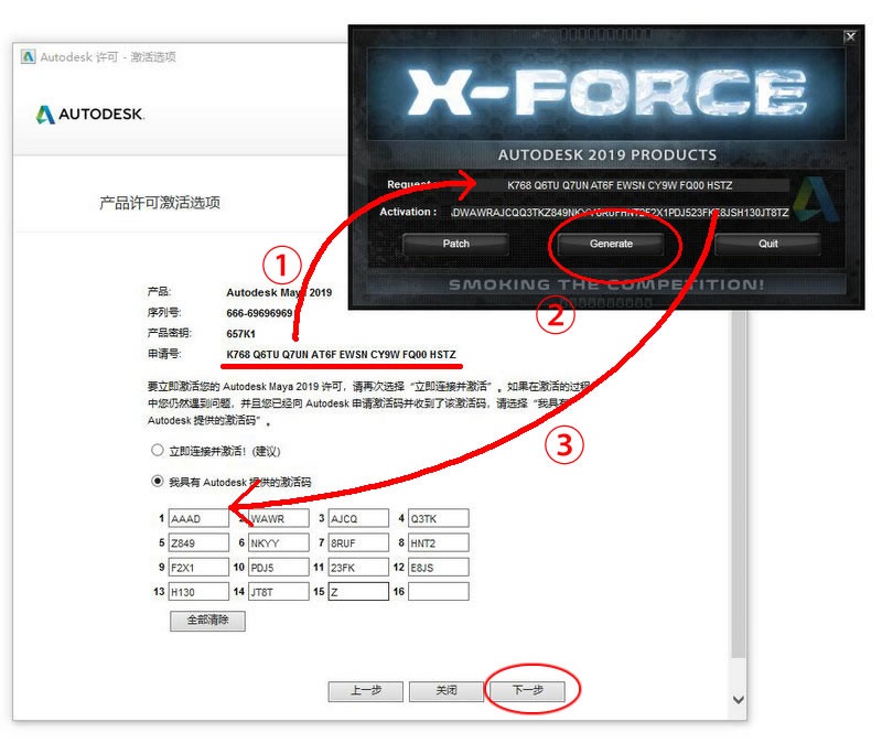 9、复制申请号到注册机的上面的框中,再点中间的按钮【Generate】,注册机下框会生成激活码,复制激活码到软件的激活框中,输入完成后点击【下一步】。
