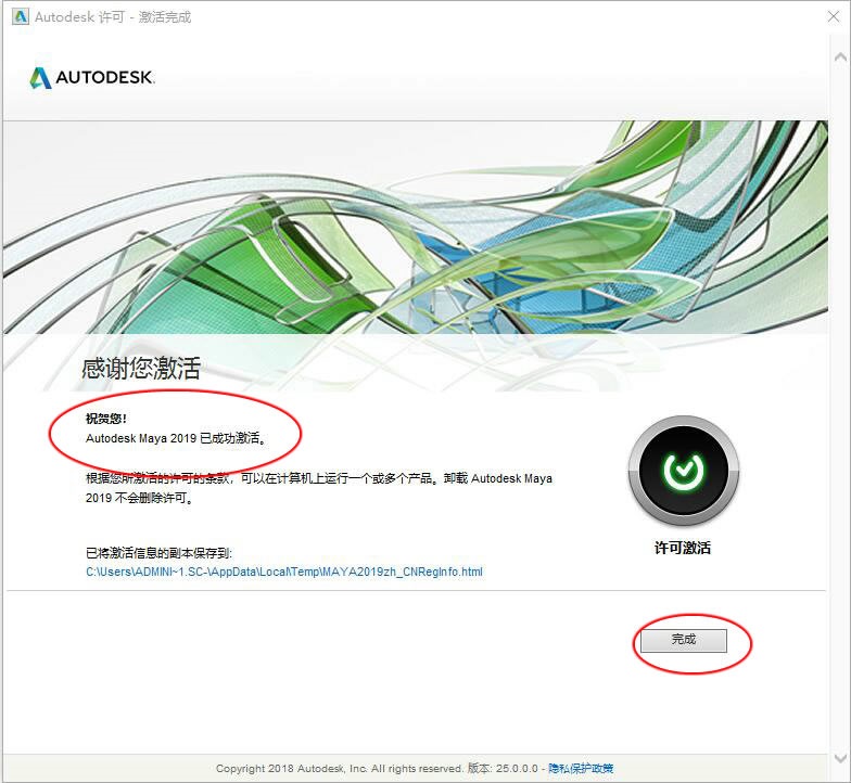 10、在打开的窗口中,您可以看到玛雅maya激活成功的提示,点击【完成】就可以了。
