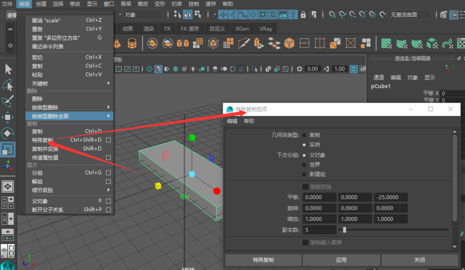 2、点击玛雅Maya菜单栏中的【编辑】在弹出的选项中点击【特殊复制】,或者通过快捷键Ctrl+Shift+D打开特殊复制选项窗口。