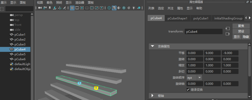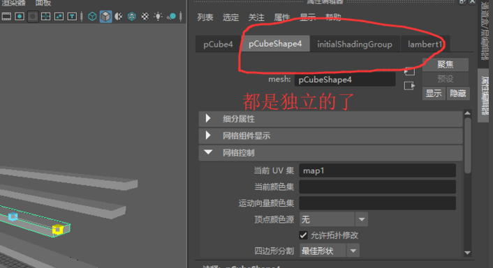 4、点选复制后的物体,在属性编辑器中,您可以看到它们除了最后一个变换属性是各自不同的,前面的pCubeShape1/polyCube1等等属性,包括网格模型,材质等,都是公用的。