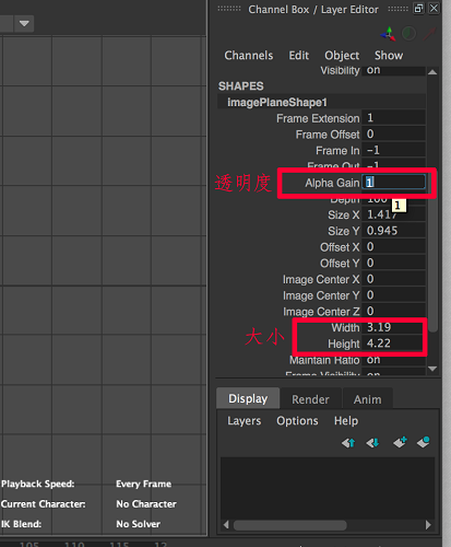 5、在图片的的右侧通道盒里可以调整图片的透明度和大小等各种属性。