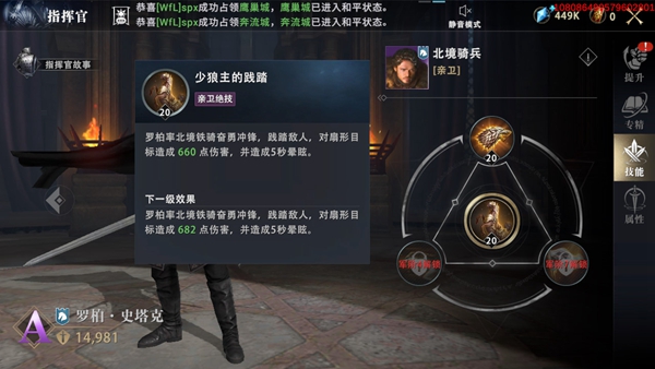 技能为扇形的指挥官中,罗柏·史塔克是领主最为熟悉的。罗柏·史塔克的亲卫绝技是[少狼主的践踏],释放时可践踏敌人,对扇形目标内的敌人造成伤害,并造成眩晕效果。