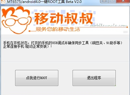 打开同步工具(如:豌豆荚等)并确认驱动都安装好!同步工具打开的情况,请不要关闭,同时打开移动叔叔一键ROOT工具。