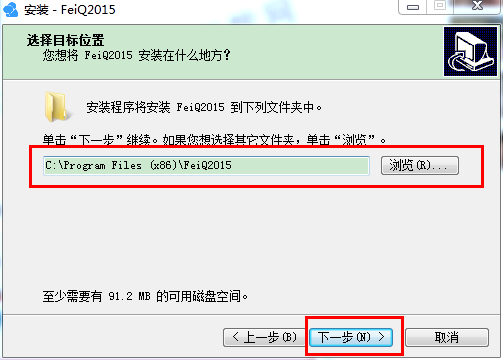 2、选择目标位置:默认是安装在C盘目录下的,可单击浏览自定义安装路径。确认好飞秋安装路径后点击下一步。