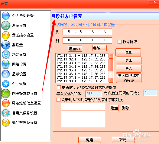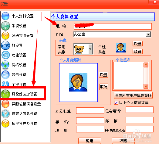 3、打开设置之后,先修改一个自己的名称和组,默认用户名是电脑的登录用户,设置好之后,选择左侧的“网段好友IP设置”,打开“网段好友IP设置”界面。输入你好友的网段地址,点击增加